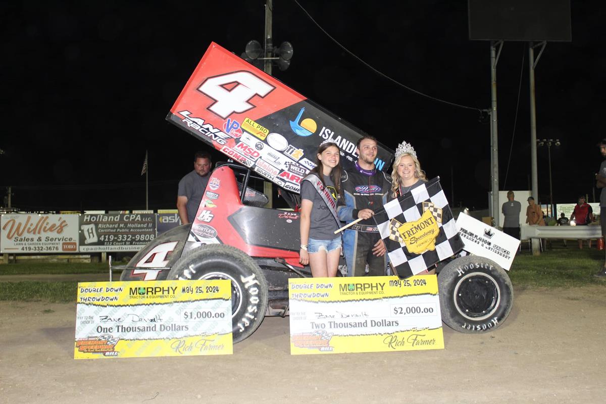 FREMONT, Ohio – Zane DeVault “doubled down” at Fremont Speedway Presented by Gill Construction Saturday, May 25. The Plymouth, Indiana driver won both 20-lap 410 sprint features on Murphy Tractor and Equipment Night to claim the bonus for a total pay day of $5,000 at “The Track That Action Built.”