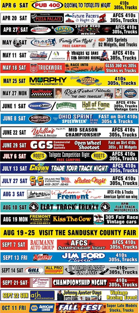 Rich Farmer, a two time RPM promoter of the year returns to Fremont, with increased purses, several special events and an increased point fund. The season will feature the Fort Ball Pizza Palace 410 Sprints, the Fremont Federal Credit Union 305 Sprints and the Burmeister Trophy Dirt Trucks, along with events featuring other divisions.